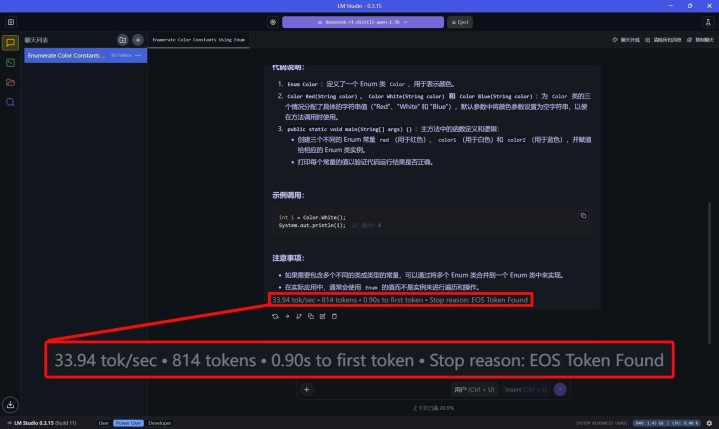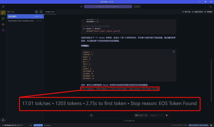 我们使用LMStudio在本地部署了DeepSeek-R1 1.5B和7B的蒸馏大模型,实测生成速度分别达到了33.94 tokens/s和17.01 tokens/s,满足日常应用没有太大问题。