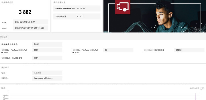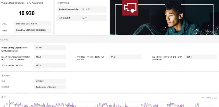 另外如果通过锐炫140V核显进行Premiere加速的话,实际上视频剪辑性能可以提升3倍。可以看到在开启GPU加速之后,视频编辑评分达到了10390分。