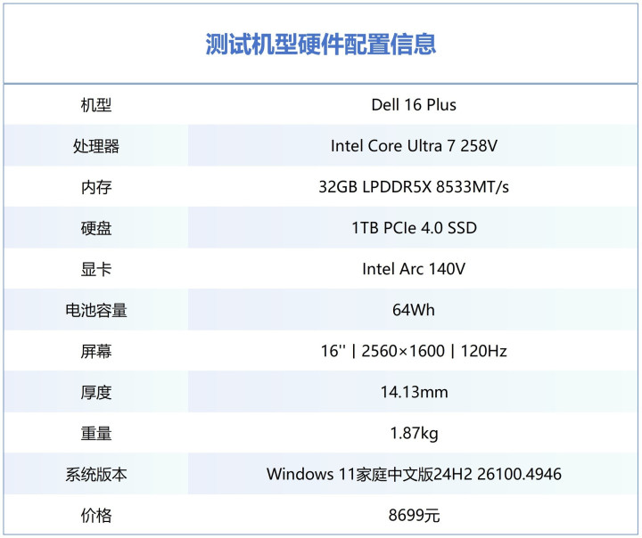 戴尔16 Plus基于英特尔酷睿Ultra 200V系列处理器打造,包含酷睿Ultra 5 226V、酷睿Ultra 5 228V以及酷睿Ultra 7 258V三种配置,本次笔者体验的机型是高配版,搭载英特尔酷睿Ultra 7 258V处理器、32GB内存、1TB固态硬盘,接下来看看其核心硬件的性能表现。