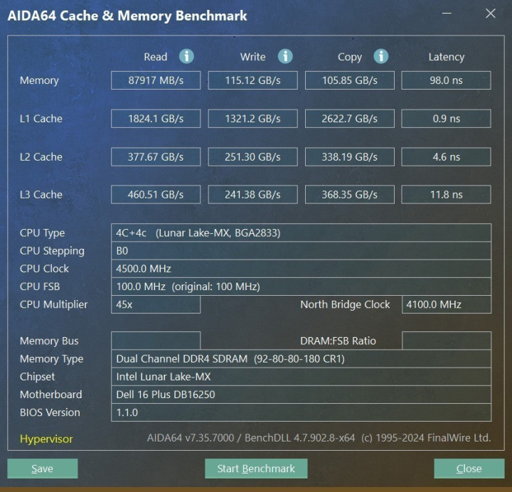 酷睿Ultra 7 258V处理器直接在片上集成了32GB LPDDR5X 8533MT/s高速内存,好处就是可以大幅降低DDR5内存的延迟。AIDA 64内存性能测试可以看到,其读取速度为87917MB/s,写入速度高达115.12GB/s,拷贝速度也达到了105.85GB/s,而延迟控制到了98ns,性能和延迟方面的表现都要比独立内存好上不少,尤其是内存延迟方面,要高于当前的平均水准。