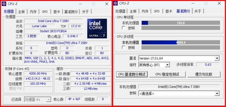 英特尔酷睿Ultra 7 258V拥有4个性能核与4个能效核,性能核睿频加速最高为4.8GHz,能效核睿频加速最高为3.7GHz,三级缓存为12MB,基础TDP为17W,最高可以达到37W。它集成了32GB LPDDR5X 8533MT/s高速内存,47TOPS算力的NPU,以及英特尔锐炫140V核显,其核显拥有8个Xe-cores,最大频率1.95GHz,AI算力64TOPS。