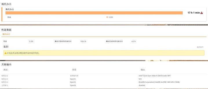 戴尔16 Plus有着非常不错的续航表现,在50%亮度、30%音量、60Hz刷新率、Wi-Fi/蓝牙全开,节能模式下,PCMark 10办公模式续航成绩为17小时1分钟,续航能力出色,满足一天不插电办公需求没有任何问题。