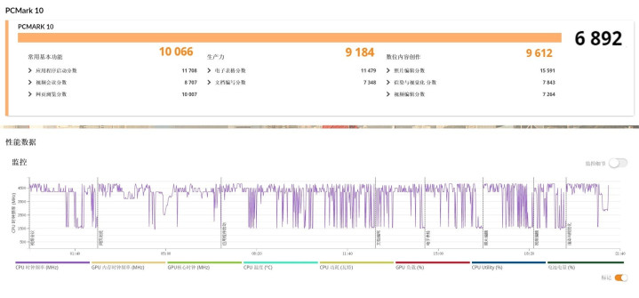 接下来参考PCMark 10办公模式测试,常用基本功能,包含Web浏览、视频会议、应用程序启动等得分为10066分,说明其完成这些基础办公任务没有任何问题;生产力项目测试中得分高达9184分,表明其拥有卓越的电子表格、文档工作性能;数位内容创作评分高达9612分,说明其能够非常高效地完成图片、视频编辑、图形渲染等工作;综合得分6892,应对日常办公、娱乐应用没有任何问题。